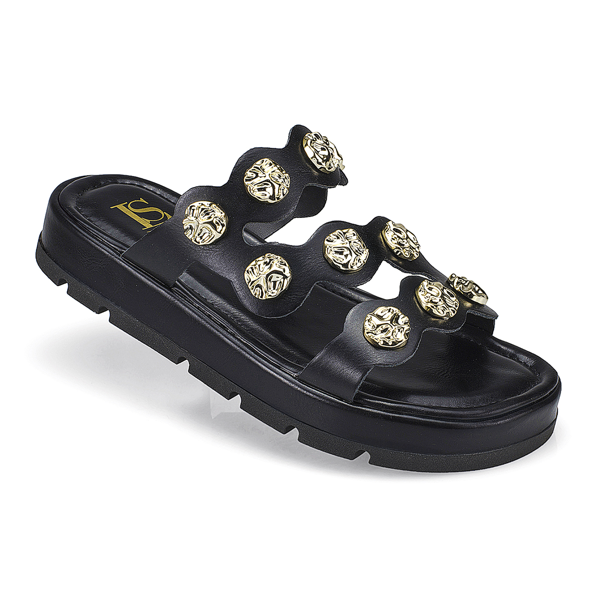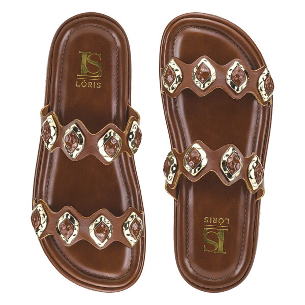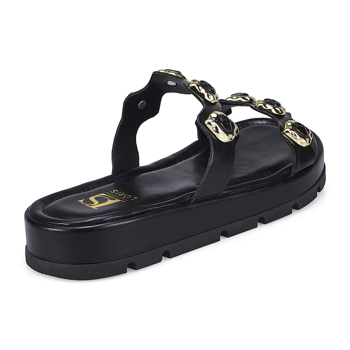 A papete com aplicação de pedras e detalhes em dourado é sinônimo de estilo e conforto. Com solado robusto e tiras largas decoradas, o modelo combina praticidade com um visual moderno e sofisticado. Ideal para quem busca um calçado versátil que se destaca em qualquer look, do casual ao mais fashionista.