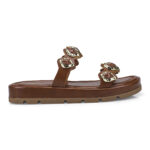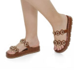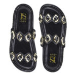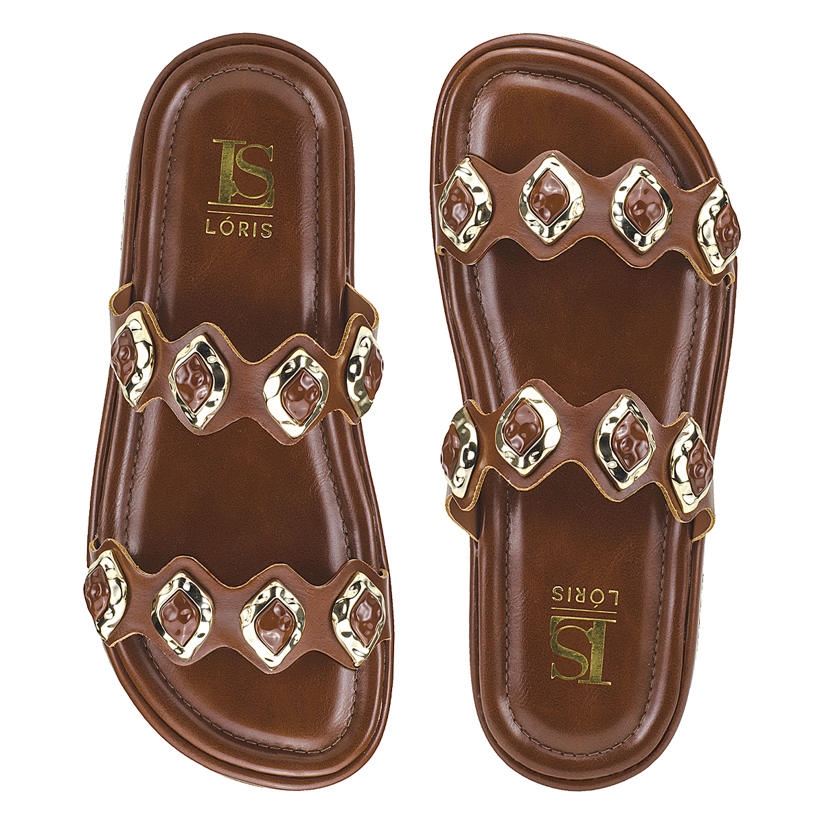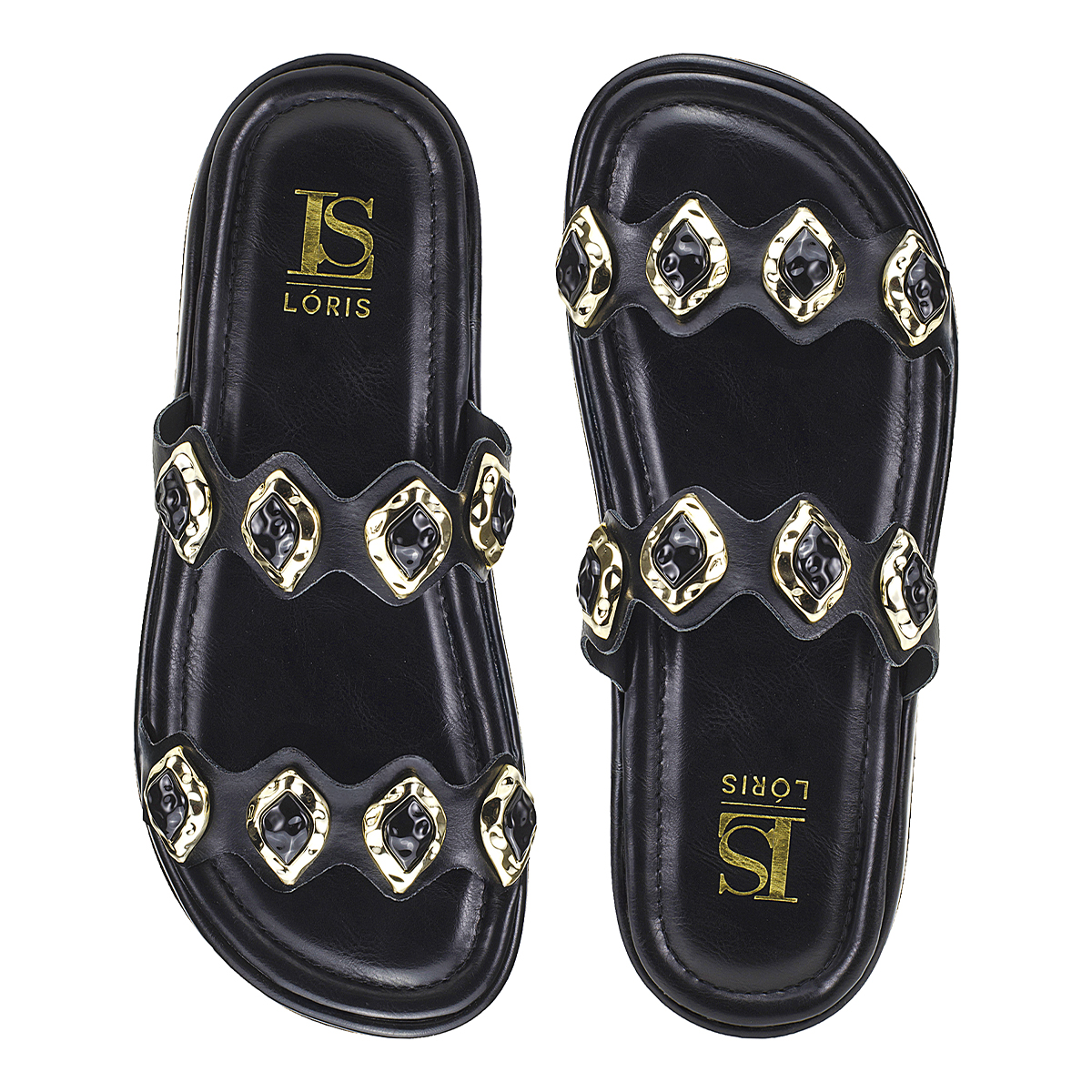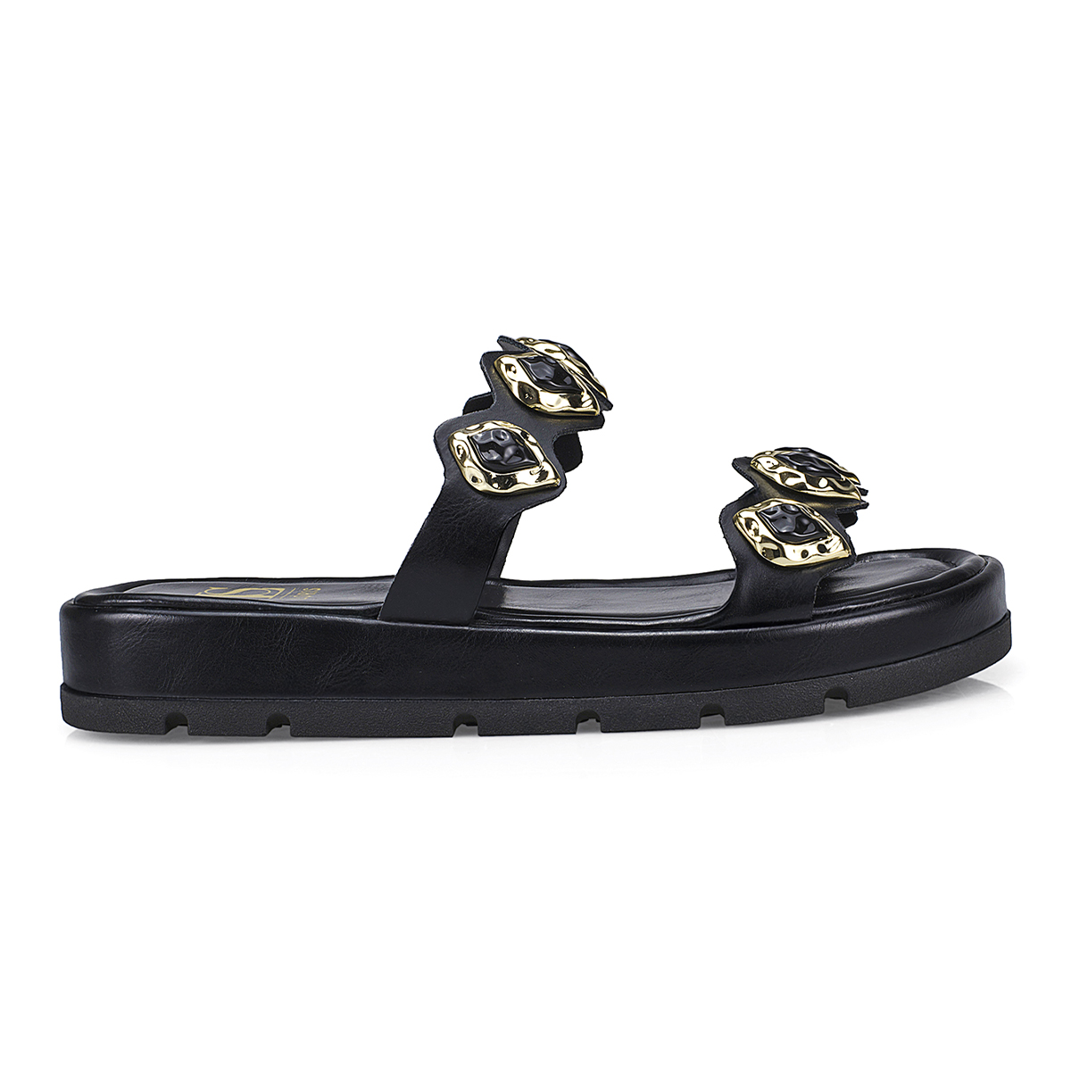 A papete com aplicação de pedras e detalhes em dourado é sinônimo de estilo e conforto. Com solado robusto e tiras largas decoradas, o modelo combina praticidade com um visual moderno e sofisticado. Ideal para quem busca um calçado versátil que se destaca em qualquer look, do casual ao mais fashionista.