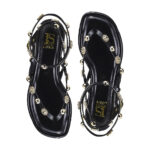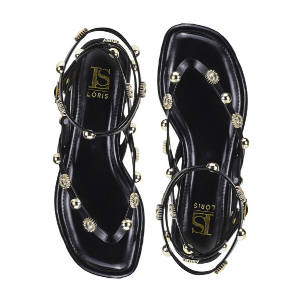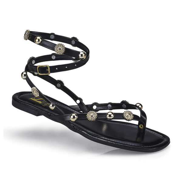 A rasteira preta com aplicações de esferas e detalhes em dourado é a escolha perfeita para quem busca estilo e conforto no dia a dia. Com design moderno, tiras finas e fechamento com fivela no tornozelo, garante firmeza ao caminhar sem perder a delicadeza. Um modelo versátil que vai do casual ao sofisticado com muito charme.