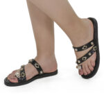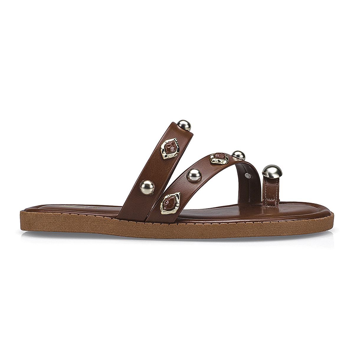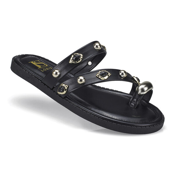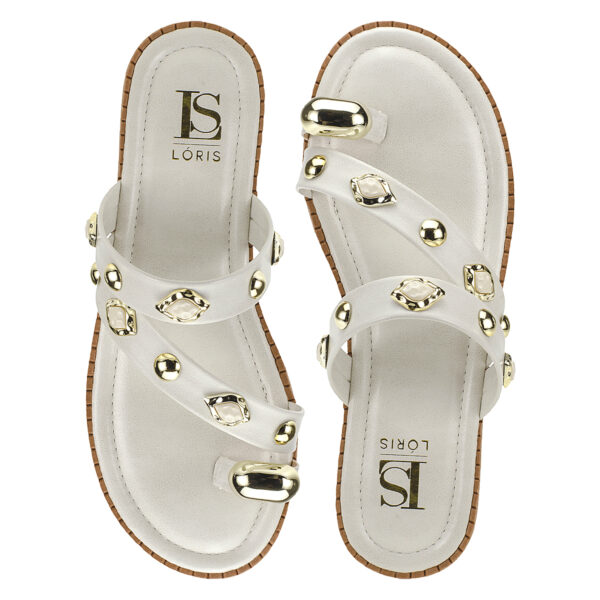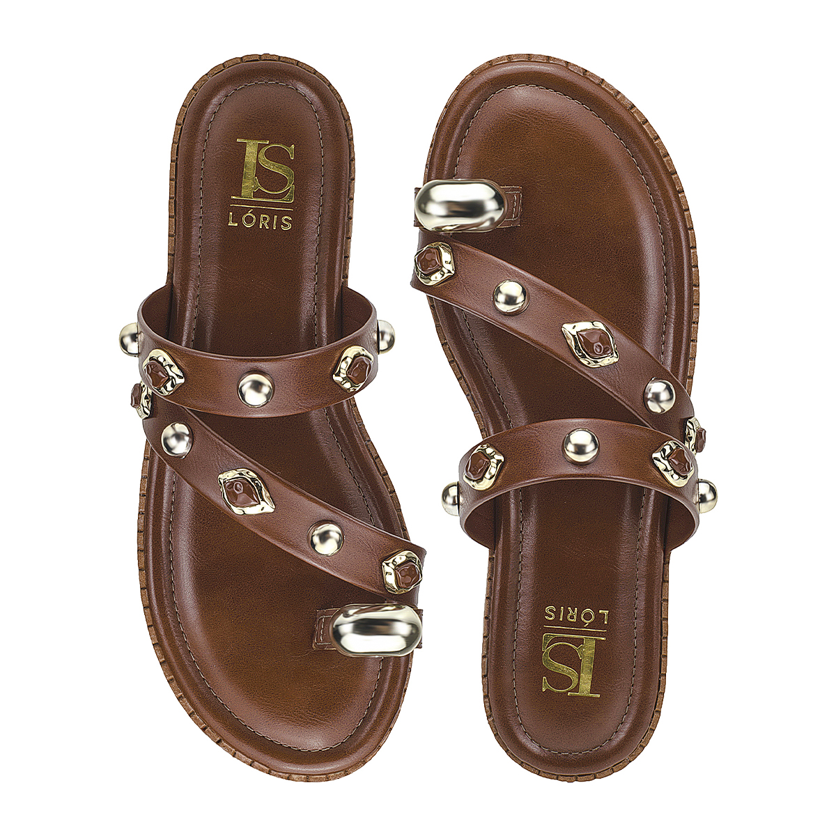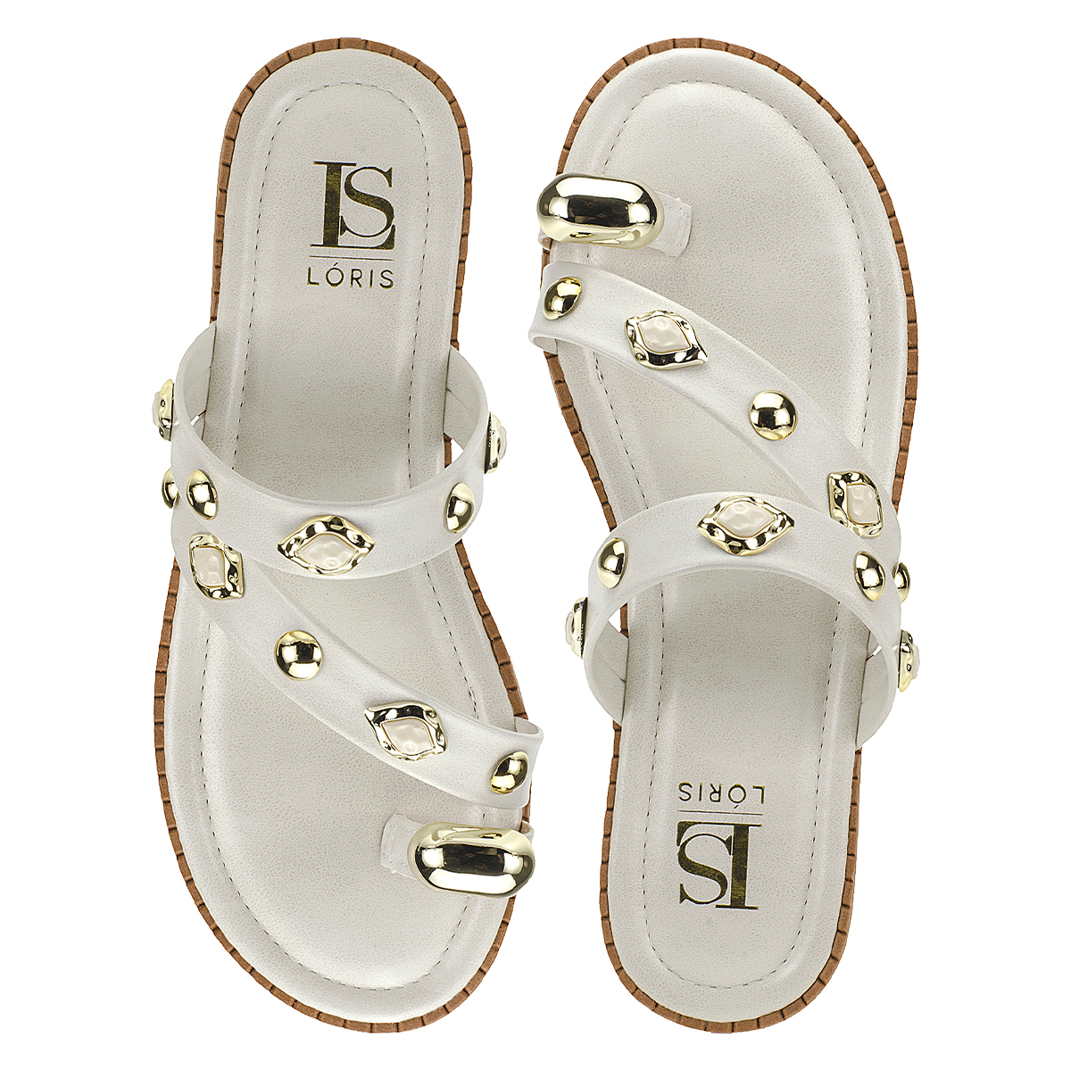 Sandália rasteira feminina Loris Shoes, desenvolvida em material sintético de alta qualidade. O modelo traz design moderno com tiras finas adornadas por aplicações metálicas em dourado e esferas prateadas, que garantem um toque sofisticado e cheio de estilo. Possui palmilha macia que proporciona conforto durante o uso e solado emborrachado que oferece segurança e estabilidade ao caminhar. Versátil, combina facilmente com diferentes looks, desde produções casuais até composições mais elegantes. Uma opção ideal para quem busca praticidade sem abrir mão de charme e personalidade.
