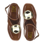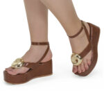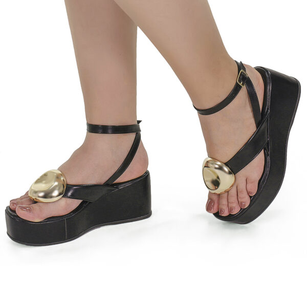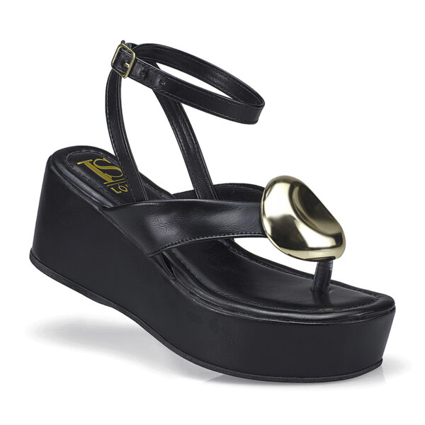 Com tiras cruzadas adornadas por aplicações metálicas em dourado, esse modelo une estilo e conforto. O fechamento por fivela ajustável garante segurança ao caminhar, enquanto a sola plataforma proporciona altura com estabilidade.