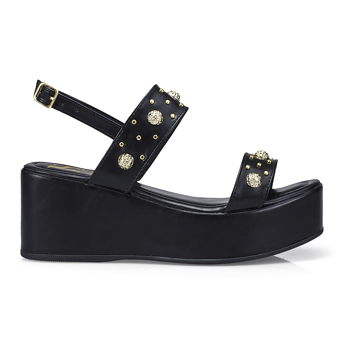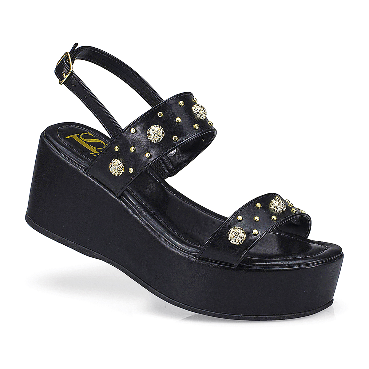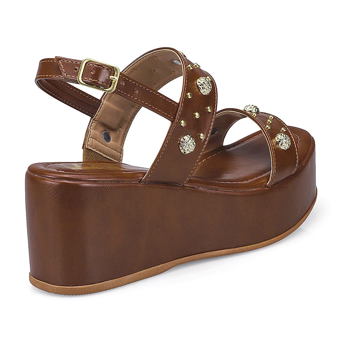 Com tiras cruzadas adornadas por aplicações metálicas em dourado, esse modelo une estilo e conforto. O fechamento por fivela ajustável garante segurança ao caminhar, enquanto a sola plataforma proporciona altura com estabilidade.