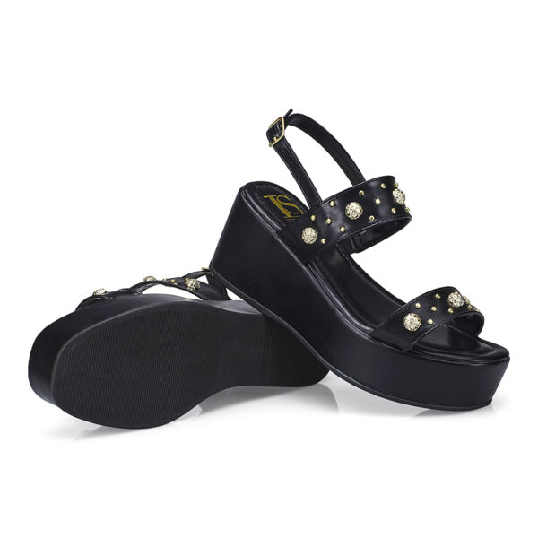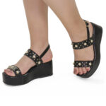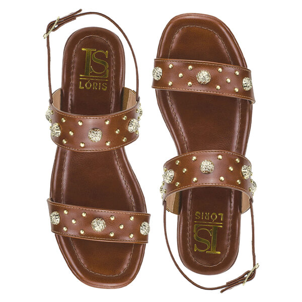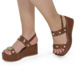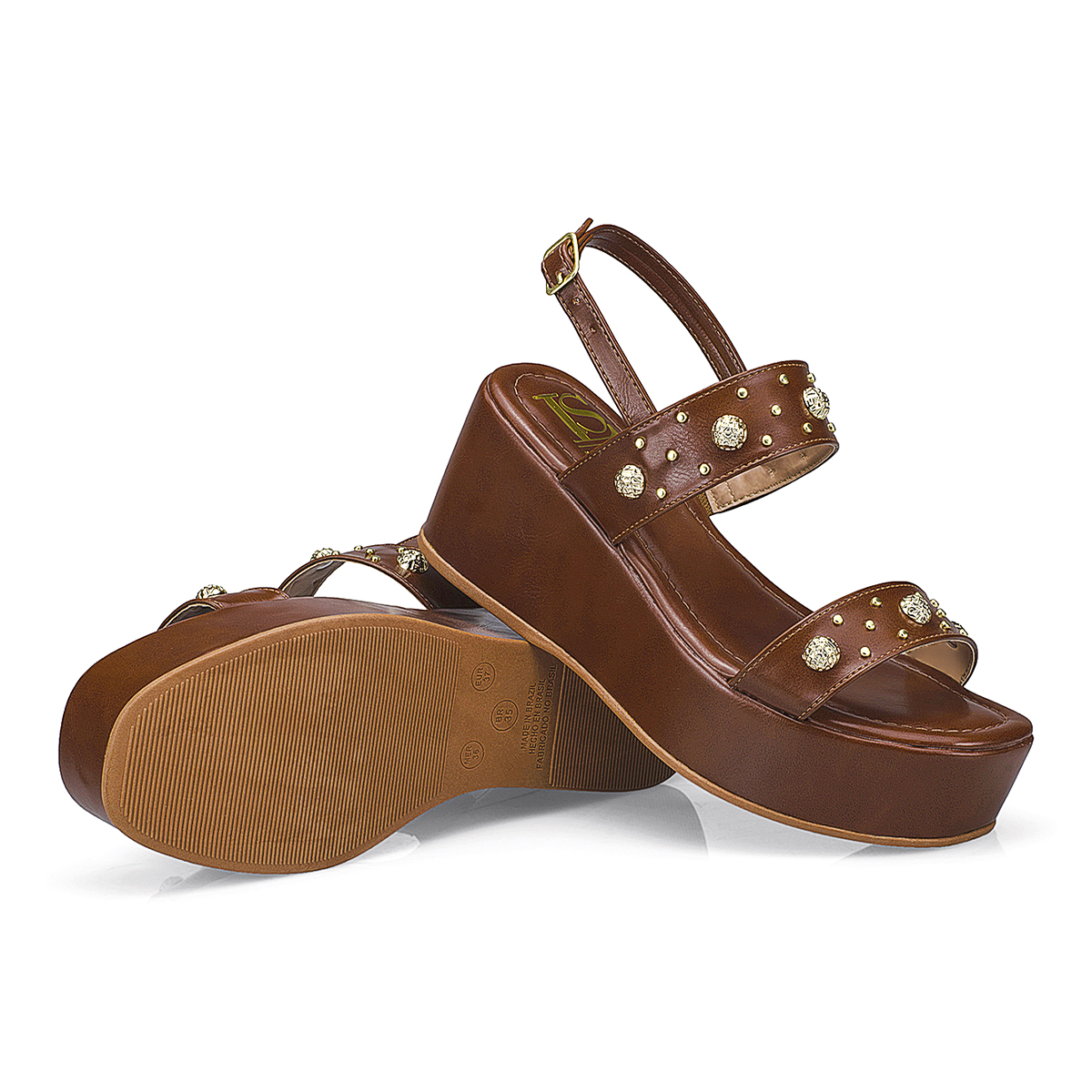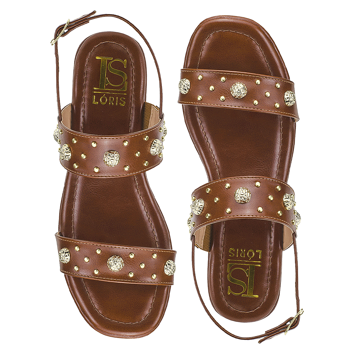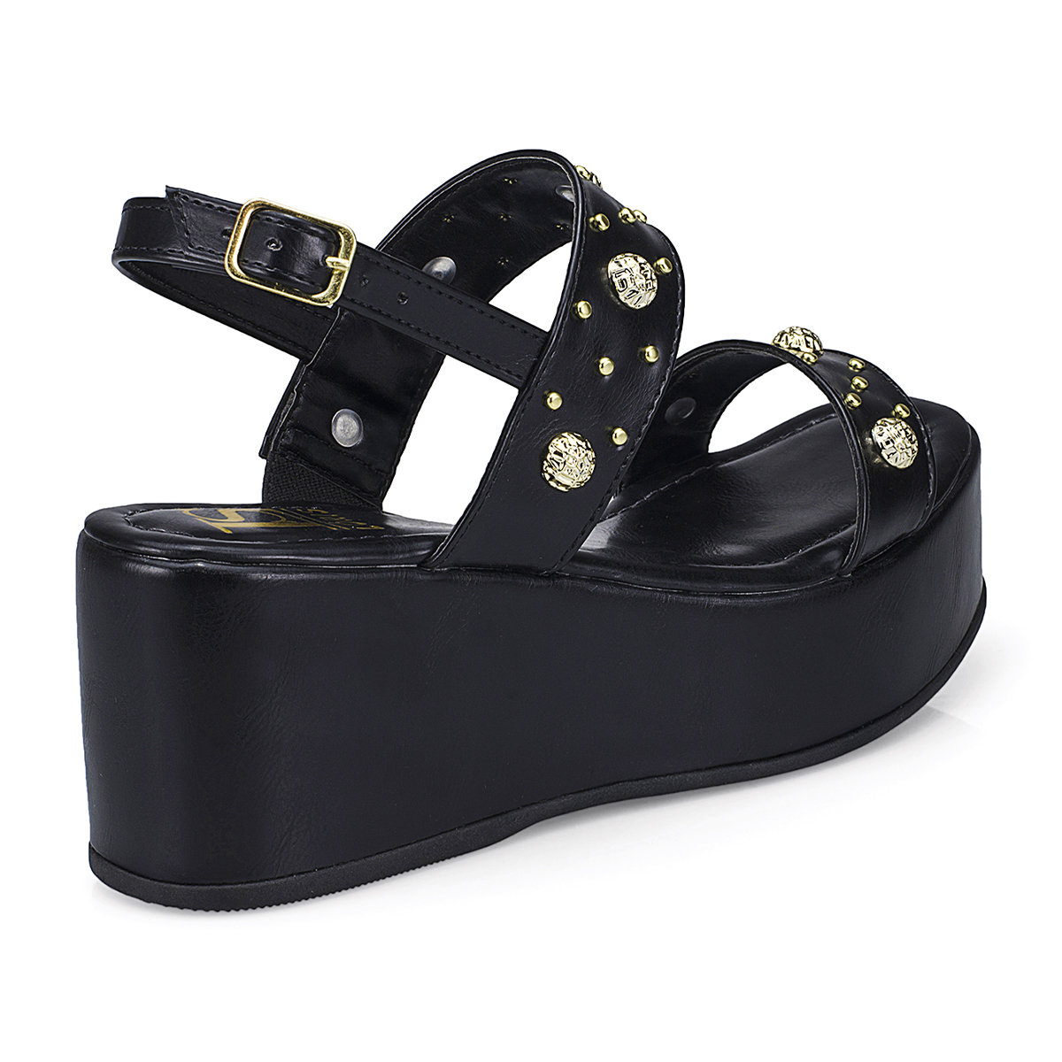 Com tiras cruzadas adornadas por aplicações metálicas em dourado, esse modelo une estilo e conforto. O fechamento por fivela ajustável garante segurança ao caminhar, enquanto a sola plataforma proporciona altura com estabilidade.